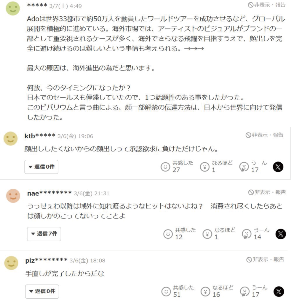 今回のAdoさんの顔出しでこれらのアーティストの対応も気になるところです。
