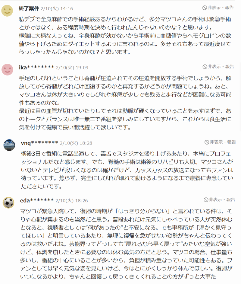 この様にマツコさんを親身になって気遣うコメントが多くマツコさんの人間性が広く受け入れられている印象を持ちました。