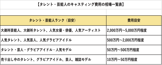 そこでタレント・芸能人のキャスティング費用の一覧のサイトを見つけましたので掲載させて頂きます。