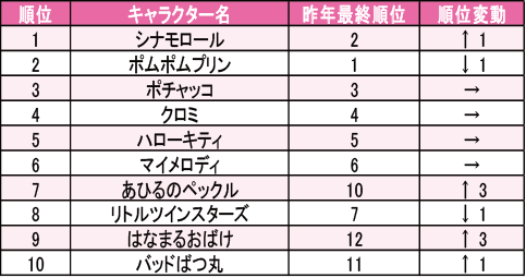 1位にランクインしたのは「シナモロール」となった。2020年から4年連続1位を獲得していたが、昨年の最終結果では2位だっただけに、今年は1位に返り咲くことができるか注目が集まる。2位には、デビュー30周年を迎えた「ポムポムプリン」がランクインを果たした。